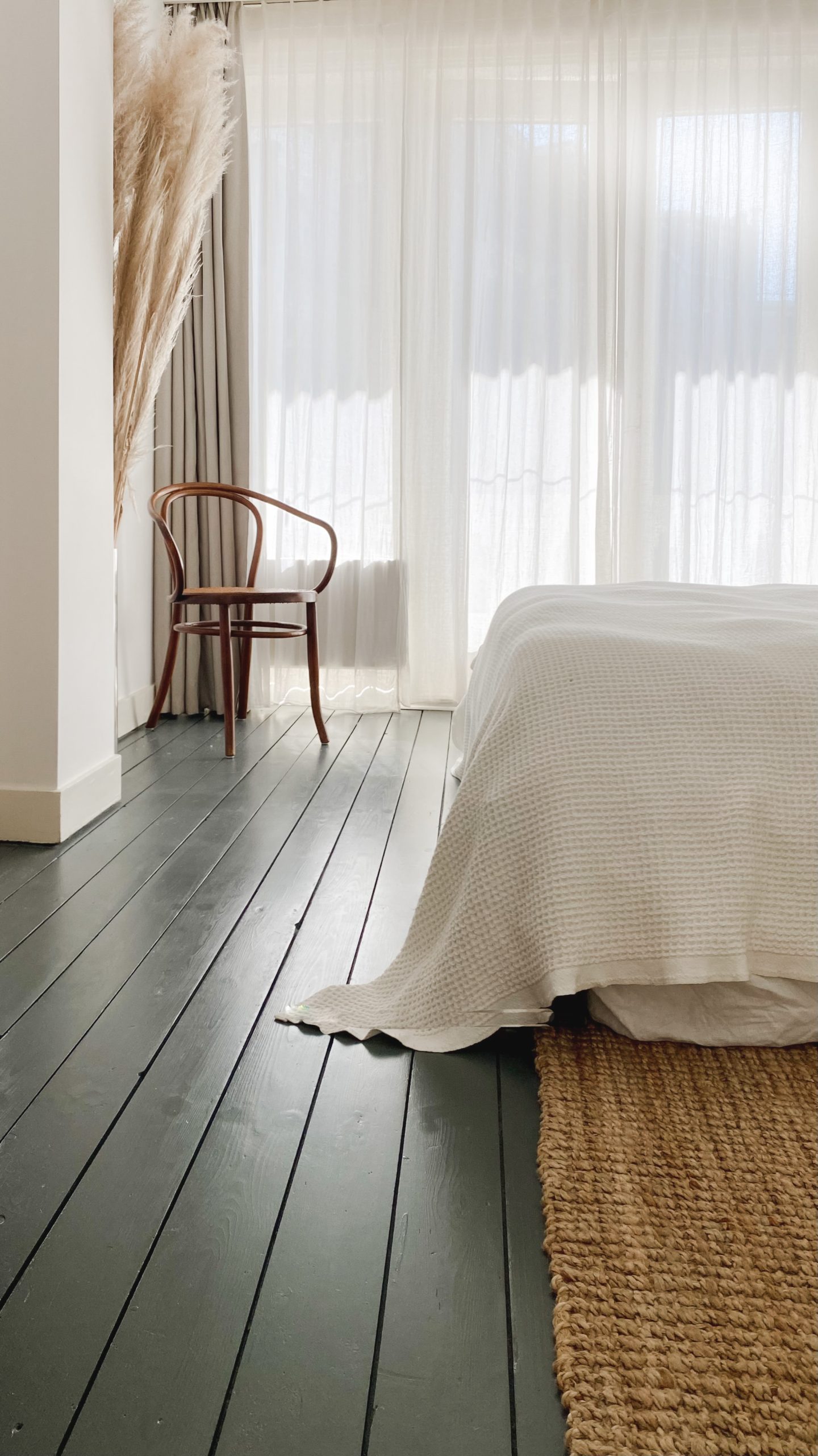 Als je wilt investeren in je interieur, dan ga je voor (vintage) design. Dat is niet alleen beter voor de wereld, maar uiteindelijk ook voor jouw portemonnee. Neem bijvoorbeeld de vintage Thonet stoel in deze lichte slaapkamer; het heeft een tijdloos design waar je nooit op uitgekeken raakt, én de stoel heeft de tand des tijds doorstaan. Die wil je nooit meer vervangen!